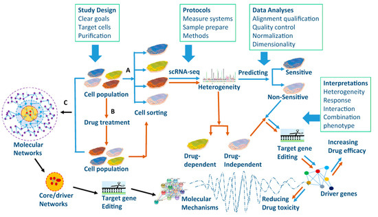 Single-cell RNA sequencing application in drug-response prediction. Targeted cell populations are selected from human organs/tissues and then one type of cell population can be sorted. Drug-dependent gene mutations and drug specificity of targeted genes can be defined after selected cells are treated with drugs (B, brown arrows). On the other hand, gene sequences and epigenetics of selected cells can be measured before the cell sorting (C, black arrows) to compare the cell population with single-cell sequences. Molecular mechanisms, drug efficacy, and toxicity of identified core/driver genes and networks can be validated by editing target genes. Reprinted with permission from ref. [157]. Copyright 2017 SpringerLink.