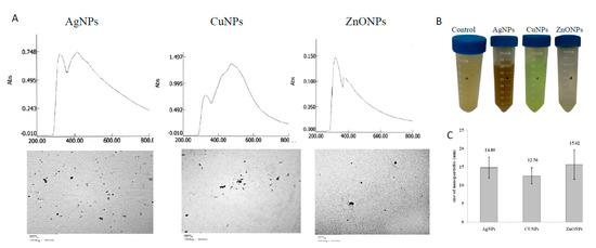 Phytosynthesis of silver nanoparticles (AgNPs), copper nanoparticles (CuNPs), and zinc oxide nanoparticles (ZnONPs) by aqueous extract of Zingiber officinale. (A), UV-Vis analyses (upper panel) and TEM images (lower panel) of the synthesized NPs. (B) The visual appearance of NPs. (C), Average sizes of synthesized NPs.