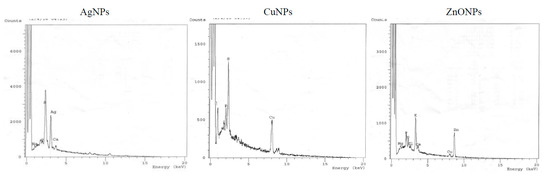 Energy dispersive X-ray microanalysis (EDX) of AgNPs, CuNPs, and ZnONPs synthesized using aqueous extract of Zingiber officinale.
