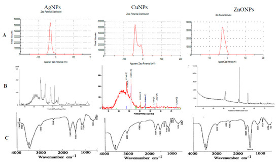 Zeta potential (ζ-Potential) (A), X-ray powder diffraction (XRD) (B), and Fourier infrared (FTIR) analyses (C) of AgNPs, CuNPs, and ZnONPs synthesized by aqueous extract of Zingiber officinale.