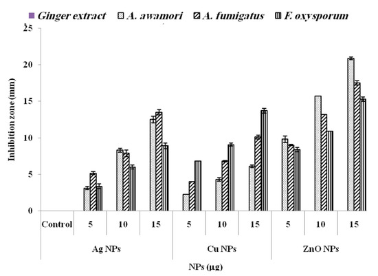 Zone of inhibition (ZOI) of AgNPs, CuNPs and ZnONPs against Aspergillus awamori JQ695830.1, A. fumigatus JX006238, and F.oxysporum FR11 treated with 5, 10, and 15 μg of AgNPs, CuNPs, and ZnONPs synthesized by aqueous extract of Zingiber officinale.