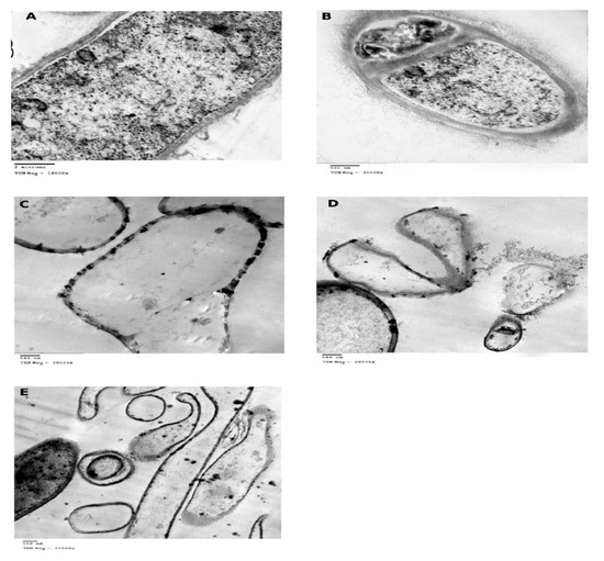 The TEM micrographs of control and ZnONPs-treated A. awamori were shown in Figure 5A–E. Ultrathin sections of control cells revealed the cell wall and septum with 700 and 230 nm in thickness, respectively, normal plasma membrane and well-organized cytoplasm with few electron-dense areas (Figure 5A,B). TEM micrographs of ZnONPs-treated A. awamori cells revealed the presence of NPs within the cell wall layers, septum, and attached to cell surfaces indicating their affinity towards A. awamori. The septum became very thin (immeasurable) (Figure 5C,D). The cell wall became thinner (140 nm) with the complete absence of extracellular fibrillar material, revealing the enhanced permeability of fungal membrane and internalization of NPs. The ruptured cell wall and leakage of the cellular contents was observed (Figure 5D,E). The fungicidal activity of ZnONPs could be explained. Firstly, potential formation of hydrogen bonds between oxygen atoms of ZnONPs and hydroxyl groups of cellulose molecules of fungi, generating H2O2. Secondly, membrane injury by the abrasive surface of ZnONPs which has defects such as edges and corners [64]. Thirdly, the expression of stress response genes, superoxide dismutase, and glutathione S-transferase were significantly induced by exposure to ZnONPs and ions leading to generation of reactive species (ROS) [65]. Nanoparticles and their ions show a genotoxic effect and destroy DNA. They interact with proteins containing –SH and cause protein denaturation. More than one mechanism can work simultaneously [66].