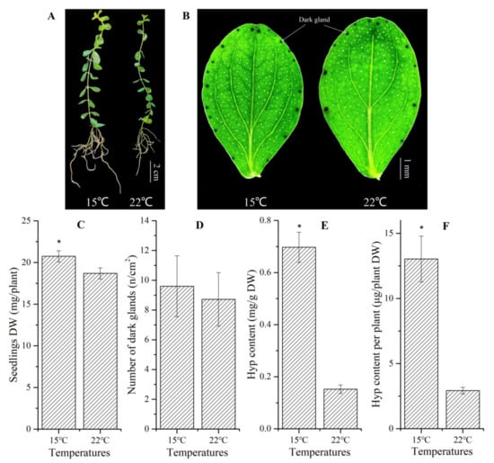 Biomass, dark glands and Hyp content in Hypericum perforatum seedlings grown at 15 and 22 °C. Dry weights (DW) of whole seedlings (A,C), number of dark glands (B,D) and Hyp contents on a DW and per plant basis ((E,F), respectively). The “*” is considered significant at p < 0.05 between 15 and 22 °C.