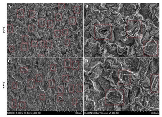Stomata structure of H. perforatum seedlings grown at 15 and 22 °C. GC, guard cell and SP, stomatal pore. Images (A,B) represent the scope 100 and 40 μm at 15 °C, images (C,D) represent the scope 100 and 40 μm at 22 °C, respectively.