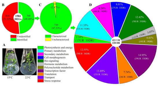 Distribution and classification of differentially expressed genes (DEGs) at 15 versus 22 °C. UR, upregulated and DR, downregulated. Image (A) represents the phenotype at 15 and 22 °C, image (B) represents the classification of unidentified and identified genes, image (C) represents the classification of uncharacterized and characterized genes, and image (D) represents the classification of the functional genes.