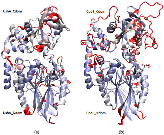 Two-domain structures of (a) UshA and (b) CpdB. A structural alignment of the crystal structure of a closed conformer of UshA (PDB: 1HPU, chain C) [30] with a homology model of CpdB [27] was generated with the VMD MultiSeq plugin [31], and it was used to color both proteins by structure conservation (blue, conserved; red, not conserved). UshA_Ndom, UshA_Cdom, CpdB_Ndom, and CpdB_Cdom (N-terminal and C-terminal domains of UshA or CpdB).