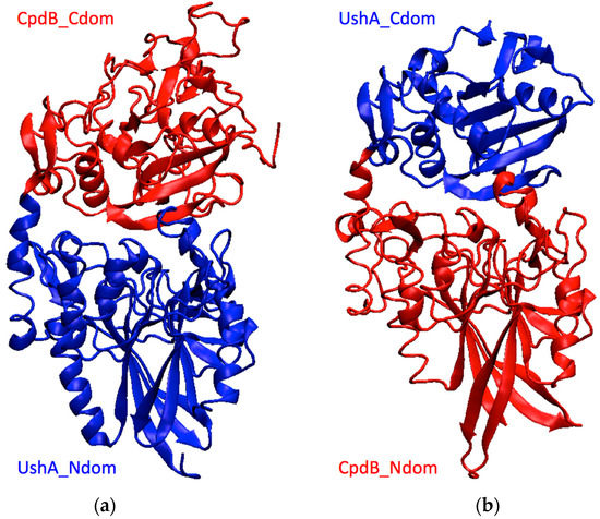 Models of the chimeras obtained by homology. (a) UshA_Ndom–CpdB_Cdom, (b) CpdB_Ndom–UshA_Cdom. Blue, UshA domains; red, CpdB domains.