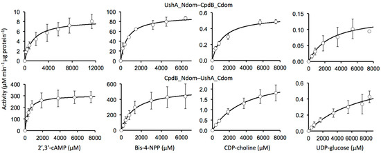 Substrate specificity and kinetic parameters of UshA_Ndom–CpdB_Cdom and CpdB_Ndom–UshA_Cdom. All of the data for chimeras were obtained with Mn2+ as the activating cation. The kinetic parameters were derived from the saturation curves that are shown in Figure 3. The results are expressed as mean values ± standard deviations of 3–8 replicates. Native-enzyme data are from earlier work (UshA [32,33,34]; CpdB [35]) shown here only for comparison with the chimeras: all of them correspond to Mn2+-dependent activities [32,35], except some UshA data that were obtained with Mg2+ [33] or Co2+ and Ca2+ [34].
