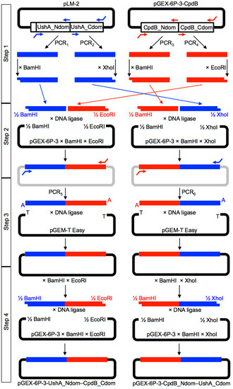 UshA_Ndom–CpdB_Cdom and CpdB_Ndom–UshA_Cdom coding sequences were constructed in four steps, as summarized in Figure 4.