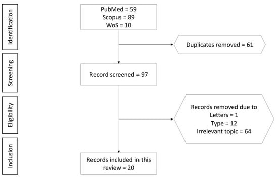 A total of 158 articles were retrieved from the literature search, of which 59 were from PubMed, 89 were from Scopus and 10 were Web of Science. After removing duplicates (n = 61), 97 articles were screened. Seventy-seven articles not meeting the selection criteria were eliminated (12 review articles, 1 editorial letter and 64 articles not relevant to the current review). Finally, 20 articles fulfilling all criteria mentioned were included in the review (Table S2). The selection process from identification, screening, eligibility to inclusion of articles is shown in Figure 1.
