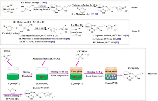 Schematic diagrams of the preparation of ILs grafted silica by reported routes and the proposed method.