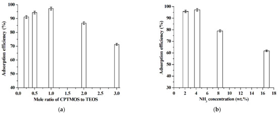 Effect of the mole ratio of CPTMOS to TEOS (a) (dosage of [C4mim]NTf2, 1.0 g; NH3 concentration, 4.2 wt%; quaternization reaction time, 12 h; mole ratio of MIM to C3Cl@SiO2 of the quaternization reaction, 3.0; adsorption test: [C3mim]+Cl−@SiO2, 40 mg; baicalin aqueous solution, 5.0 × 10−5 mol·L−1, pH 5.0, 10 mL; adsorption time, 1 h; adsorption temperature, 25 °C) and NH3 concentration (b) (dosage of [C4mim]NTf2, 1.0 g; mole ratio of CPTMOS to TEOS, 1.0; quaternization reaction time, 12 h; mole ratio of MIM to C3Cl@SiO2 of the quaternization reaction, 3.0; adsorption test: [C3mim]+Cl−@SiO2, 40 mg; baicalin aqueous solution, 5.0 × 10−5 mol·L−1, pH 5.0, 10 mL; adsorption time, 1 h; adsorption temperature, 25 °C) on the adsorption efficiency of [C3mim]+Cl−@SiO2. Experiments were conducted in triplicate.
