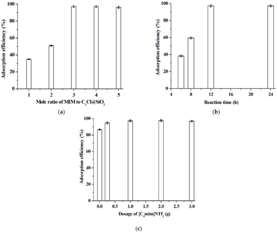 Effect of the mole ratio of MIM to C3Cl@SiO2 (a) (dosage of [C4mim]NTf2, 1.0 g; mole ratio of CPTMOS to TEOS, 1.0; NH3 concentration, 4.2 wt%; quaternization reaction time, 12 h; adsorption test: [C3mim]+Cl−@SiO2, 40 mg; baicalin aqueous solution, 5.0 × 10−5 mol·L−1, pH 5.0, 10 mL; adsorption time, 1 h; adsorption temperature, 25 °C), reaction time of quaternization (b) (dosage of [C4mim]NTf2, 1.0 g; mole ratio of CPTMOS to TEOS, 1.0; NH3 concentration, 4.2 wt%; mole ratio of MIM to C3Cl@SiO2 of the quaternization reaction, 3.0; adsorption test: [C3mim]+Cl−@SiO2, 40 mg; baicalin aqueous solution, 5.0 × 10−5 mol L−1, pH 5.0, 10 mL; adsorption time, 1 h; adsorption temperature, 25 °C) and dosage of [C4mim]NTf2 (c) (mole ratio of CPTMOS to TEOS, 1.0; NH3 concentration, 4.2 wt%; mole ratio of MIM to C3Cl@SiO2 of the quaternization reaction, 3.0; quaternization reaction time, 12 h; adsorption test: [C3mim]+Cl−@SiO2, 40 mg; baicalin aqueous solution, 5.0 × 10−5 mol·L−1, pH 5.0, 10 mL; adsorption time, 1 h; adsorption temperature, 25 °C) on the adsorption efficiency of [C3mim]+Cl−@SiO2. Experiments were conducted in triplicate.