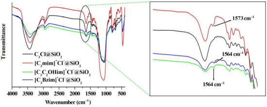 Elemental analysis and FT-IR spectra were used to confirm whether the ILs were grafted onto the surface of silica. Elemental analysis indicates that the N contents (wt%) of C3Cl@SiO2, [C3mim]+Cl−@SiO2, [C3C2OHim]+Cl−@SiO2 and [C3Bzim]+Cl−@SiO2 are <0.01%, 1.52%, 1.26%, and 1.26%, respectively. The increase in the N content confirms the successful grafting ILs onto the silica surface. The FT-IR spectra of C3Cl@SiO2, [C3mim]+Cl−@SiO2, [C3C2OHim]+Cl−@SiO2 and [C3Bzim]+Cl−@SiO2 are illustrated in Figure 5. As can be seen, compared with C3Cl@SiO2, a new absorption peak can be observed for the ILs grafted silica (1564−1 for [C3C2OHim]+Cl−@SiO2 and [C3Bzim]+Cl−@SiO2 and 1573 cm−1 for [C3mim]+Cl−@SiO2), which corresponds to the C=N stretching vibration of the imidazolium ring [40,41]. This observation also suggests that the ILs are successfully grafted onto the silica surface.