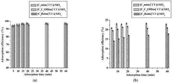Adsorption efficiency of [C3mim]+Cl−@SiO2, [C3C2OHim]+Cl−@SiO2 and [C3Bzim]+Cl−@SiO2. (a) Cbaicalin = 5.0 × 10−5 mol·L−1 and (b) Cbaicalin = 9.0 × 10−3 mol·L−1. Experimental conditions: adsorbent, 40 mg; volume of baicalin aqueous solution, 10 mL; pH 5.0; adsorption temperature, 25 °C. Experiments were conducted in triplicate.