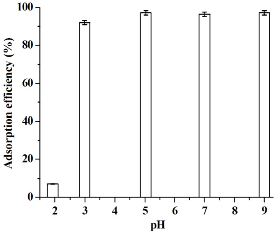 Effect of pH of water phase on the adsorption efficiency of [C3mim]+Cl−@SiO2. Experimental conditions: Cbaicalin = 5.0 × 10−5 mol·L−1; [C3mim]+Cl−@SiO2, 40 mg; volume of baicalin aqueous solutable 10 mL; adsorption time, 10 min; adsorption temperature, 25 °C. Experiments were conducted in triplicate.