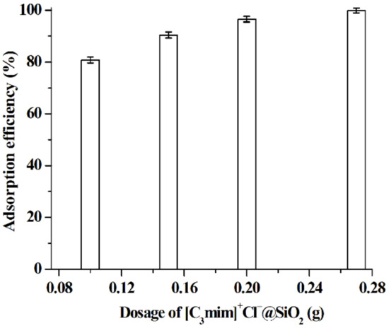 Effect of dosage of [C3mim]+Cl−@SiO2 on the adsorption of baicalin from 10 mL of the root extract of SBG. Experimental conditions: Cbaicalin = 1.9 × 10−3 mol·L−1; adsorption time, 10 min; pH 5.0; adsorption temperature, 25 °C. Experiments were conducted in triplicate.