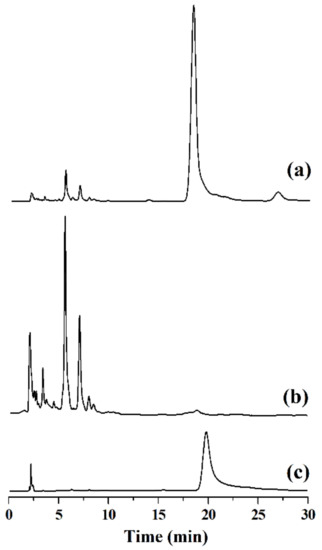 HPLC chromatograms of the root extract of SBG (a), the root extract of SBG after adsorption (b), and baicalin obtained from the desorption solution (c).