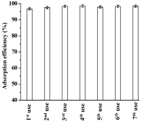 Reusability of [C3mim]+Cl−@SiO2 for the adsorption of baicalin from the root extract of SBG. Experimental conditions: adsorption temperature, 25 °C; adsorption time, 10 min; pH, 5.0; [C3mim]+Cl−@SiO2, 0.2 g; volume of the root extract of SBG, 10 mL. Experiments were conducted in triplicate.