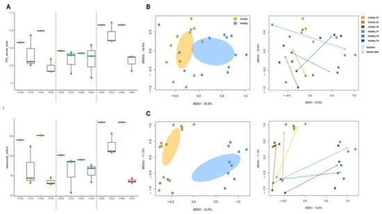 The faecal-derived microbial communities of the Coeliac donor (n = 1) differ from those of the healthy donor (n = 1) in fermentation experiments in the presence of C. pyrenoidosa extract (Sun Chlorella ‘A’ Powder). (A) Boxplots showing alpha diversity, measured according to Faith’s Phylogenetic Diversity index (PD whole tree) and observed ASV metrics, in fermentation samples from Coeliac (C) vs. healthy (H) donor, collected at baseline (SS1) (B) or after addition of C. pyrenoidosa upon reaching the steady state (SS2) (S), from the 3 vessels of the gut model (V1 vs. V2 vs. V3). Principal coordinates analysis (PCoA) based on weighted (B) and unweighted (C) UniFrac distances, showing all fermentation samples, stratified by sample origin (Coeliac vs. healthy, left panels) and fermentation condition/time point (vessel 1, 2 and 3; baseline vs. steady state; right panels). A significant separation between Coeliac and healthy samples was found regardless of all other variables (p ≤ 0.002, permutation test with pseudo-F ratio). The arrows indicate the direction of the temporal variations observed within the faecal-derived microbial communities of the Coeliac vs. healthy subject in the three vessels, from the baseline to the steady state.