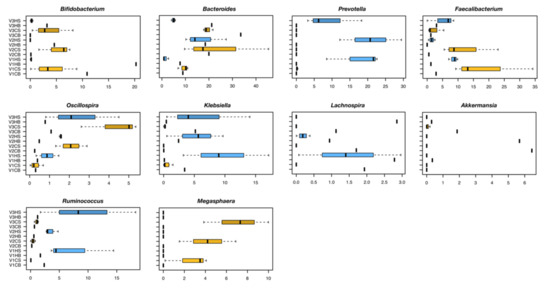 Genus-level differences in the faecal-derived microbial communities between the Coeliac (n = 1) and healthy donor (n = 1) following fermentation with C. pyrenoidosa extract (Sun Chlorella‘A’ Powder). Boxplots showing the relative abundance distribution of bacterial genera differentially represented among the study groups (vessels (V) 1, 2 and 3, inoculated with faeces from Coeliac (C) vs. healthy (H) donor, at baseline (B) and steady state (S) after addition of C. pyrenoidosa extract (Sun Chlorella ‘A’ Powder). (p ≤ 0.1, Kruskal−Wallis test).