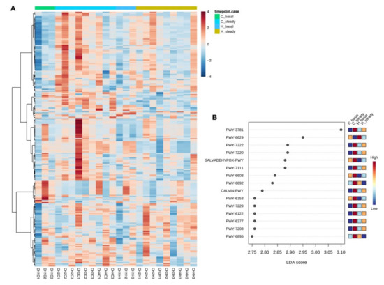 Functional differences in the faecal-derived microbial communities between Coeliac (n = 1) and healthy donor (n = 1) samples at baseline and following fermentation with C. pyrenoidosa extract (Sun Chlorella ‘A’ Powder).(A) Hierarchical clustering of the inferred metagenomes of the study groups (Coeliac (C) vs. healthy (H) donor, at baseline (basal) and steady state (steady) after addition of C. pyrenoidosa extract (Sun Chlorella ‘A’ Powder).The heatmap shows Ward-linkage clustering based on the Kendall’s correlation coefficients of the abundance profile of the 238 most abundant pathways identified. (B) Linear discriminant analysis effect size (LEfSe) analysis showing the differentially represented pathways upon addition of C. pyrenoidosa extract (Sun Chlorella ‘A’ Powder) for both C and H samples. The pathways are indicated with the MetaCyc ID.