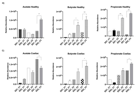 The faecal-derived microbial SCFAs (acetate, butyrate, propionate) of the healthy (n = 1) and Coeliac (n = 1) donors in fermentation experiments in the presence of C. pyrenoidosa extract (Sun Chlorella ‘A’ Powder). (H) 1H-NMR analysis of SCFAs relative abundance in vessels (V1, V2, V3) from healthy donor before (SS1) and following fermentation with C. pyrenoidosa extract (Sun Chlorella ‘A’ Powder). (SS2) (3 g/day). Significance of one-way ANOVA with Tukey’s posthoc comparison after treatment: * p < 0.05; ** p < 0.001 and *** p < 0.0001. (C) 1H-NMR analysis of SCFAs relative abundance in vessels (V1, V2, V3) from Coeliac donor before (SS1) and following fermentation with C. pyrenoidosa extract (Sun Chlorella ‘A’ Powder). (SS2) (3 g/day). Significance of one-way ANOVA with Tukey’s posthoc comparison after treatment: * p < 0.05; ** p < 0.001 and *** p < 0.0001.