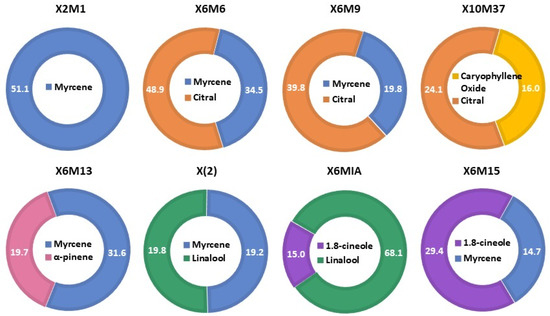 The essential oil of the X6M15 genotype disclosed 1,8-cineole and myrcene as its major constituents (29.40 and 14.70%, respectively, Figure 1). The existence of a 1,8-cineole:myrcene chemotype was reported by Ricciardi, 2009 [31], in which the amounts of these compounds reached only 14.70% and 10.40%, respectively.1,8-cineole is a saturated monoterpene with pleasant aroma and taste, widely used in food, fragrances, and cosmetics [64]. Plenty studies have reported the substances as having benefits for respiratory tract infection, such as bronchitis, sinusitis as well as exhibiting secretolytic and bronchospasmolytic properties, and anti-inflammatory, antimicrobial, and antiseptic efficacy [64].