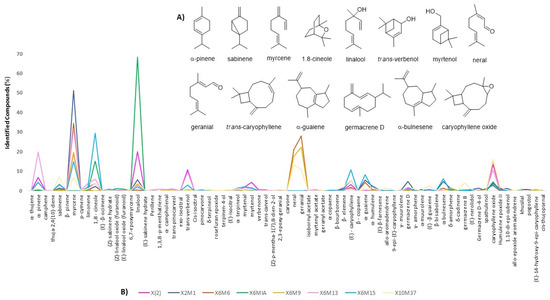 The analysis of the essential oil chemical composition from eight genotypes of L. alba allowed the identification of 73 secondary metabolites, as disclosed in Table 2. In general, the constituents identified in oils belong to the terpenoids class, with the following predominance: monoterpene hydrocarbons (1.53–59.79%) and oxygenated monoterpenes (9.99–86.44%), sesquiterpene hydrocarbons (3.07–30.49%), and oxygenated sesquiterpenes (3.96–19.49%), from which α-pinene, β-myrcene, 1,8-cineole, linalool, citral (neral + geranial), and caryophyllene oxide were the most abundant compounds among the accessions, enabling the separation of the genotypes into different chemotypes of L. alba Figure 1. In addition, an overlap of the chemical composition of all genotypes displayed the compounds sabinene, trans-verbenol, myrtenol, (E)-caryophyllene, α-guaiene, germacrene D, and α-bulnesene in relevant quantities in some of the genotypes, as disclosed in Figure 2A (chemical structures) and Figure 2B (identified compounds in the essential oils). The relative percentage of all identified compounds is shown in Table 2.