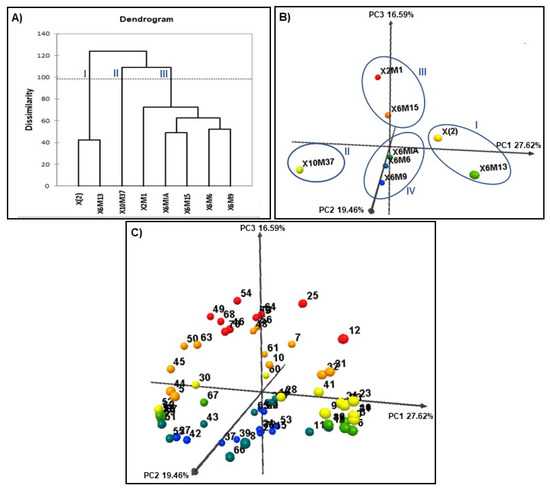 These analyses allowed to distinguish the samples in four main groups: (X(2) and X6M13, group I), (X10M37, group II), (X6M15 and X2M1, group III), and (X6M6, X6M9, and X6MIA, group IV). This classification had been previously supported by the dendrogram from the HCA analysis, mainly allowing the distinction of the groups I and II.