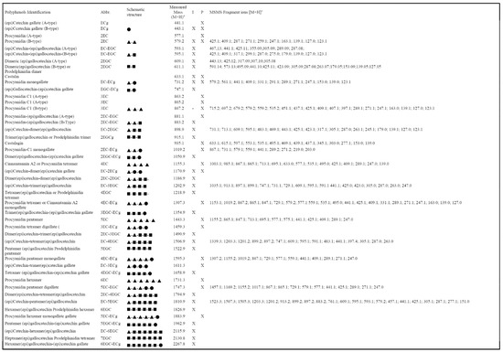 - Bowers, J.J.; Gunawardena, H.P.; Cornu, A.; Narvekar, A.S.; Richieu, A.; Deffieux, D.; Quideau, S.; Nishanth, T. Rapid Screening of Ellagitannins in Natural Sources Via Targeted Reporter Ion Triggered Tandem Mass Spectrometry. Sci. Rep. 2018, 8, 10399. [Google Scholar] [CrossRef] [PubMed]