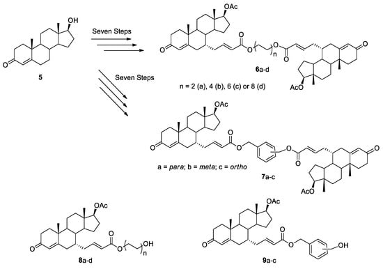 Synthesis of C2-symmetric testosterone dimers 6a–d and 7a–c by esterification reaction and their precursor’s 8a–d and 9a–c.
