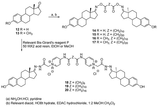 In order to modulate estrogen receptor alpha (ERα)-mediated transcription events, Wendlant et al. developed a series of symmetric estrogen dimers linked at position C-17 [18]. The first series of dimers, comprised of compounds 14 to 17, was fabricated through the use of oxime chemistry [19] by starting from estrone 12 or estrone 3-methyl ether 13 (Figure 5). A stability analysis was conducted and proved that the dimers were robust under various conditions. However, all compounds were analyzed for their agonist affinity for ERα and none of them showed a superior affinity to that of 17β-estradiol. In response to those results, dimers 18, 19, and 20 were synthesized in the hope of increasing ERα affinity. Those compounds were fabricated via the use of a Girard-based linker, which increases the hydrophilicity of the targets. Of all these compounds, the dimer 19 showed the best results with a binding efficacy to ERα of about 125% compared with that of estrogen at optimal concentration. This dimer was also evaluated for its binding specificity and was found to link strongly to ERα whereas it was inactive against the three steroid hormone receptors, which include progesterone receptors (PR), androgen receptors (AR), and glucocorticoid receptors (GR). In vivo studies are still needed to evaluate the drug potential of this new candidate.