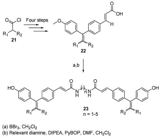With the aim of modulating the activity of the estrogen receptor (ER), a recent approach consisted of designing C2-symmetric dimers to bridge both ligand binding sites of a dimeric ER [20]. In order to exploit this strategy, Knox et al. developed a series of cyclophenylacrylic acid dimers, which can downregulate the activity of ER [21]. The choice of structure for those dimers was based on crystallographic and theoretical studies [22,23]. The synthetic route to form those dimers is shown in Figure 6. Starting from the relevant acyl chloride 21, a Friedel–Crafts acylation with anisole followed by a Grignard reaction with 4-bromobenzaldehyde protected as acetal results in a compound that can be treated with acid to deprotect the acetal and dehydrate the hydroxyl group, which forms the diphenyl core. Then, a Wittig–Horner reaction with trimethyl-/triethylphosphonoacetate and hydrolysis allows the formation of compound 22. The anisole ring is then converted to phenol and a treatment of the resulting compound with DIPEA, PyBOP, and the corresponding diamine spacer results in the formation of 23. Of all the derivatives formed in the study, two principal series can be distinguished: the first corresponds to a derivative of GW7604 [23], where R1 is a phenyl group and R2 is an ethyl group; the second series is composed of cyclofenil derivatives [24], where R1 and R2 are linked by a cyclohexyl ring. In both these series, the number of carbons of the diamine spacer varies between one and five.