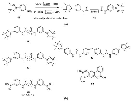 A different research project from Furutachi et al. described the synthesis of C2-symmetric phenyl boronic acid pinacol esters with different linkers and reported their biological potential as antiviral and antibacterial agents [34], and more recently, as anticancer agents [35]. The general structure 45 is illustrated in Figure 11a. These dimers are easily prepared by reacting amino-phenyl boronic acid pinacol esters 44 with relevant dicarboxylic acid dichlorides in the presence of triethylamine (for example, leading to 46) or with diisocyanide to obtain 49 (Figure 11b). Dimer 47 was synthesized by reacting the precursor bis-amide with Lawesson’s catalyst with 55% yield. A unique symmetric compound 50 was obtained with 35% yield from 2,5-diphenylhydroquinone reacted with BCl3 and AlCl3. The same research team also described several dimeric pinacol acids [36,37].