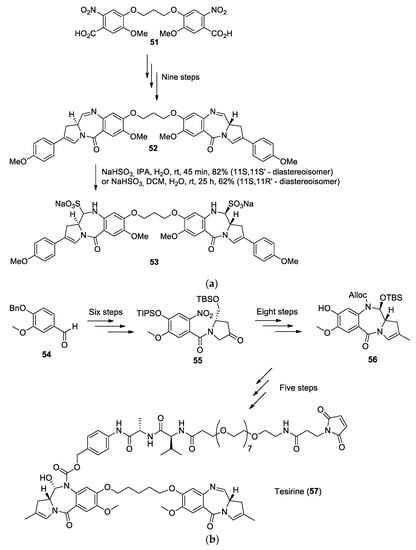The antitumor properties of pyrrolo[2,1−c][1,4]benzodiazepine (PBD) compounds have been studied since 1963, when they were first isolated from the fermentation broth of the thermophilic actinomycete Streptomyces refuineus [38]. An initial biological screening of the extract showed a specific activity against Gram-positive organisms and an antitumor activity against sarcoma 180 and adenocarcinoma 755 mouse tumor systems [38]. It was later understood that the molecular structure of PBD compounds allows them to fit in DNA minor grooves and the electrophilic carbon of the imine group reacts with the amine of guanine bases, revealing the alkylating properties of PBDs [39]. In order to enhance their cross-linking properties, synthetic PBD dimers linked by their phenolic C8-positions via flexible ether bridge were investigated, since molecular modeling and NMR studies showed that this type of linkage could allow both PBD units to perform intrastrand or interstrand DNA cross-links, a hypothesis that was later reinforced by DNA-binding studies [39]. To that end, Howard et al. synthesized interesting PBD dimers in a nine-step synthesis (Figure 12a) by starting from the known 2-nitrobenzoic acid dimeric core (51) [40]. The key steps of this synthesis are the tetralactam formation, which was achieved with Raney nickel and hydrazine followed by a Suzuki coupling reaction. The resulting dimer SG2202 (52) was then tested in vitro, where it exhibited significantly higher cytotoxicity than other known PBD dimers [40]; however, the lack of hydrosolubility of SG2202 limited the in vivo assay. In order to resolve this problem, the prodrug SG2285 (53) was also synthesized by adding a bisulfite moiety at the C11 and C11′ positions. Both of these dimers were then tested on ten human tumor cell lines via an Alamar Blue assay. Although the prodrug SG2285 was slightly less effective than SG2202, both dimers showed a cytotoxic activity in the picomolar range for all cell lines tested, the best results being observed for the T lymphoblast cell lines CCRF-CEM, with an IC50 of 0.1 pM for SG2202 and 1.4 pM for SG2285 [40]. Further studies also demonstrated the cross-linking activity of SG2202 and SG2285 [41].