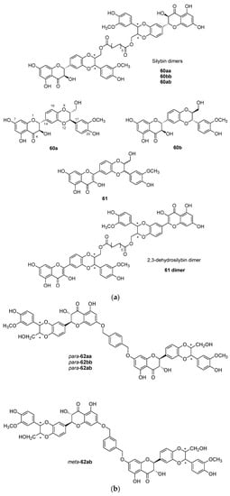 It is now established that flavonoids provide several health benefits, including anti-oxidative, anti-inflammatory, anti-mutagenic, and anti-carcinogenic properties, along with being able to modulate certain enzyme functions [53]. Silybin is a flavonolignan product extracted from the milk thistle (Silybum marianum (L.) Gaertn. (Asteraceae)), also named silymarin [54]. It is isolated as a mixture of two diastereoisomers silybin A (60a) and silybin B (60b) (Figure 14a), and they possess antioxidant and hepatoprotective activities. Interestingly, 2,3-dehydrosilybin 61 displays higher antioxidant and anticancer activities than silybin [55,56]. Generally, dimerization of these products (60a, 60b) produces compounds with higher biological potential [54].