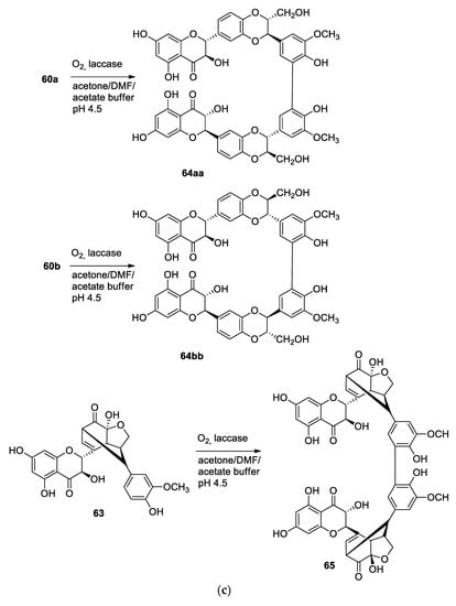 In another study, Gavezzotti et al. proceeded to dimerize the flanovolignans silybin A (60a), silybin B (60b), and silydianin (63) [58,59,60] at position C-21. In each case, the key step of the dimerization (Figure 14c) involves an enzymatic oxidative coupling using laccase from Trametes versicolor. The DPPH scavenging activity of the three dimers 64aa, 64bb, and 65 was tested, along with their corresponding precursors [60]. All the dimers show a better DPPH scavenging activity than their precursors, the most active compound being the dimer 65 with an IC50 of 7.92 ± 0.05 µM, a significant improvement compared with the substrate 63, which showed an activity of 27.4 ± 0.7 µM. However, none of the activities of the compounds tested in this study surpassed the DPPH scavenging activity of the known antioxidant Trolox, which displays an IC50 of 4.18 ± 0.1 µM [61].