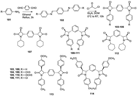 Compounds containing the β-lactam ring, such as penicillin or cephalosporin, are known to possess antibacterial activity due to their capacity to inhibit the synthesis of bacterial cell walls [85]. More recently, these compounds were also proven to possess certain antitumor activity [86]. A series of symmetric β-lactam dimers were produced by reaction of an aromatic dialdehyde with various amines 101 to yield a series of Schiff bases 102 (Figure 20) [87]. These imines were then treated with chloroacetyl chloride, or the corresponding acyl chloride, in order to form compounds 103 to 114, illustrated in Figure 20. Those novel molecules were exposed to nine different bacterial strains to examine their antibacterial activities. The results varied from low to medium, the most active dimer being molecule 109, which notably showed an inhibition zone of 26 mm for the strains Proteus vulgaris, Salmonella typhi, and Staphylococcus aureus. However, some intermediate compounds involved in the formation of dimers 113 and 114 were more active than the dimers, and none of the novel compounds were more active than the reference drugs amoxicillin and ceftriaxone, which had an inhibition zone of 30 mm in every tested strain. Tested for their in vitro anticancer activity, the compounds showed variable results. The best results was obtained with dimer 104 with IC50 values of 0.41, 0.42, and 0.45 µM against cervical HeLa, breast MDA-MB-231, and renal ACHN cell lines, respectively. These results are even higher than that obtained for doxorubicin, which highlights the biological potential of β-lactam dimers in the discovery of new anticancer drugs.