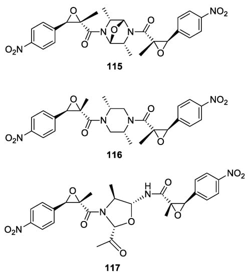 Three natural products possessing two trans-epoxyamide were isolated from the deep-sea fungus penicillium chrysogenum (115–117) [88]. The structures of the compounds were characterized by IR, 1H-, and 13C-NMR spectroscopy and by mass spectrometry. X-ray diffraction analysis of compounds 115 and 116 was performed, confirming the spectral analysis. Interestingly, two of the dimers (115 and 116) feature a center of symmetry (Figure 21).