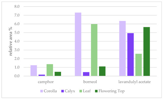 Figure 2. Relative area % of camphor, borneol, and lavandulyl acetate in each portion of L. angustifolia, namely the corolla, calyx, leaf, and whole flowering top. The profiles of the calyx and whole flowering top are similar. Despite the low yield of the corolla and leaf, both portions impact the profile of the whole flowering top.