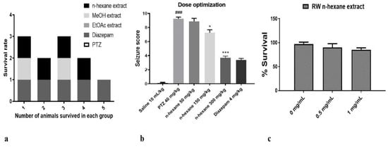 All experimental procedures were set according to the protocols approved by Riphah Ethical Committee, Riphah Institute of Pharmaceutical Sciences (Ref. No. REC/RIPS/2019/29). Adult male Sprague–Dawley rats weighing 270–300 g were purchased from the National Institute of Health (NIH), Islamabad, Pakistan. The experimental animals were kept in an animal house at Riphah Institute of Pharmaceutical Sciences, under a 12 h dark/light cycle at 18–22 °C and had free access to water and food throughout the study. A pentylenetetrazole (PTZ)-induced model of epilepsy was followed in this study. The animals were divided into five groups (n = 7) as follows: normal saline; PTZ administered group, diazepam administered group; PTZ + extract (the n-hexane, EtOAc and MeOH extracts; 50 mg/kg); administered experimental rats. PTZ (40 mg/kg) was used as an inducing agent, while diazepam was used as standard drug (positive control). On the basis of survival rate, only n-hexane extract was selected for further study (Figure 2a) at three different doses, including 50 mg/kg, 150 mg/kg and 300 mg/kg (Figure 2b). Convulsive behavior was observed for 30 min after each injection of PTZ and resultant seizures were scored according to the following scale: score 0, no response; score 1, behavior arrest with trembling; score 2, motionless staring and sudden arrest in animal behavior; score 3, facial twitching; score 4, neck jerks; score 5, clonic seizure in sitting position; score 6, clonic seizure but animal do not lose its balance; score 7, tonic-clonic seizure; score 8, tonic-clonic with falling on one side; score 9, wild jumping; score 10, tonic extension leading to death []. After recording these observations, rats were sacrificed and their brains were preserved in formalin (10%) solution without formalin at −80 °C for further use.