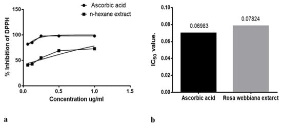 The anti-oxidant potential of n-hexane extract was also investigated in vitro through detecting the free radical (DPPH) scavenging potential. Ascorbic acid was used as a standard anti-oxidant agent. Free radical scavenging effect is evident in Figure 2a,b in terms of dose effectiveness and IC50 values. The n-hexane extract was found to possess anti-oxidant potential.