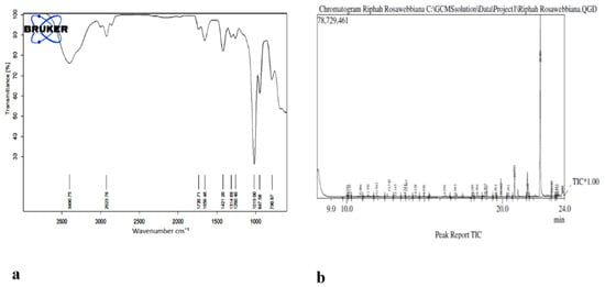 (a) FTIR spectra of n-hexane extract of Rosa webbiana. (b) GC-MS chromatogram of the n-hexane extract of fruit of Rosa webbiana.