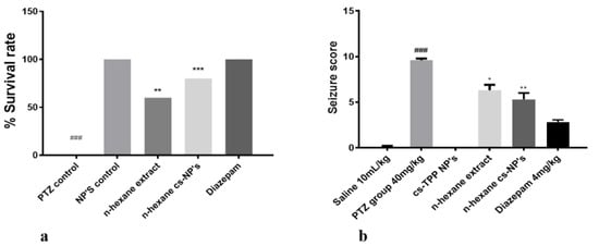 Illustrates (a) percent survival rate of all treated groups; symbols ** and *** show the significant difference from PTZ group at p < 0.01 and p < 0.001; symbol ### shows significant difference from NPs control at p < 0.00. (b) Seizure score of all treated groups; symbols *, ** and ### indicate significant differences at p < 0.05, p < 0.01 (from PTZ) and p < 0.001 (from normal saline), respectively.