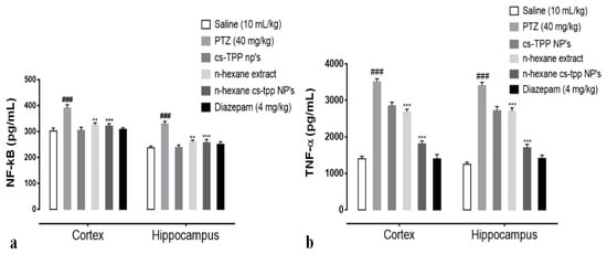 Finally, the anticonvulsant potential of cs-NPs and n-hexane cs-NPs was determined using the same protocol as described above. Experimental groups included PTZ (40 mg/kg), Diazepam (4 mg/kg), cs-NPs control, n-hexane extract and n-hexane cs-NPs CS-P.E. NPs. Results in terms of survival rate and seizure score are given in Figure 7a,b. One-way ANOVA followed by Tukey’s multiple comparisons test indicated that PTZ significantly increased seizure score and mortality with recorded seizure score as 9.600 ± 0.1871 and 100% mortality (following seizures). However, continued administration of n-hexane extract and n-hexane cs-NPs resulted in a significant reduction in seizure score in the treated groups as follows: n-hexane (300 mg/kg) treatment group: 6.300 ± 0.6042 (** p < 0.01 relative to PTZ group), mortality, 40 ± 0 (** p < 0.01 relative to PTZ group) and n-hexane cs-NPs (300 mg/kg) treatment group: 5.300 ± 0.7000 (*** p < 0.001 relative to PTZ group), mortality, 20 ± 0 (*** p < 0.001 relative to PTZ group). These results demonstrated that both the n-hexane extract and n-hexane cs-NPs exhibited a statistically significant reduction in seizure score and mortality in both the treated groups as compared to the PTZ control group; however, results in terms of reduction in seizure score were more significant in case of encapsulation of the n-hexane extract than in the case of the n-hexane extract without encapsulation (Figure 7b). After 4 days, animals were sacrificed and their brains were preserved at −80 °C for further molecular analysis.
