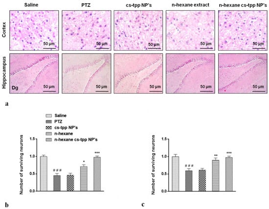 Morphological differences in the cortex and hippocampus of the brain using hematoxylin and eosin (H&E) staining were also recorded in this study. A significant reduction in the number of surviving nuclei in PTZ group compared with that of saline group is evident in both cortex and hippocampus (Figure 9). However, n-hexane extract attenuated these damages, increased the number of surviving neurons, while n-hexane encapsulated cs-NPs further improved the number of surviving neuronal cells at *** p < 0.001 (Figure 9, graphs on the right).