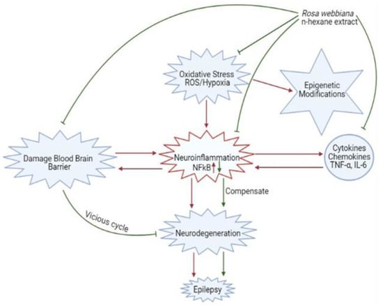 Schematic description of the contribution of oxidative stress, neuro-inflammation and blood–brain barrier destruction in epileptogenesis and the protective mechanisms of Rosa webbiana, including antioxidant mechanisms, neuroprotection through reduced cytokine release (TNF-α) and downstream NF-kB inhibition and improved drug delivery.