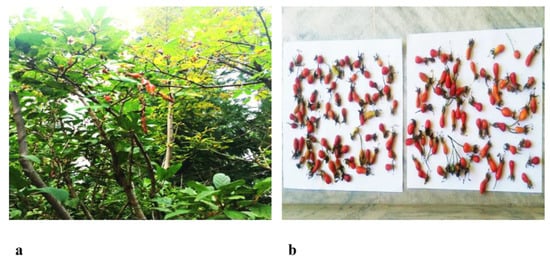 Plant material consisting of fruity twigs, was collected from Shogran, on the Siri top, situated in the Himalayan range in Pakistan (Figure 11) in August and September of 2018. The plant along with its fruit was identified and preserved at the Herbarium of Pakistan, Quaid-e-Azam University, Islamabad, Pakistan (voucher specimen number 130285). Fruit was plucked, washed, dried, crushed into coarse powder (1 kg) and macerated using different solvent systems, including n-hexane, ethyl acetate (EtOAc) and methanol (MeOH), respectively, at room temperature for 14–15 days. The three extracts (n-hexane, EtOAc and MeOH) were then filtered and the solvent was removed using a rotary evaporator under reduced pressure. The yield obtained in n-hexane, EtOAc and MeOH was 40, 33 and 30 g respectively. All the extracts were stored at −4 °C until further use.