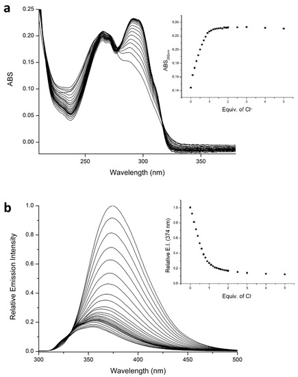 The addition of chloride affects both the [ZnL]2+ absorption and fluorescence spectra (Figure 2). In the absorption spectra, a lower energy band centered at 290 nm appears. This absorption band can be safely ascribed to the PyPD chromophore not involved in metal coordination; in fact, the free ligand L shows an intense absorption band centered at 290 nm. The emission strongly decreases, although it is not fully quenched, and the emission band shifts toward higher energy; once again, this shift is in agreement with the emission properties of the ligand in which the PyPD is not involved in coordination [42] (Figure S3). The trends of both the absorption band at 292 nm and the emission at 374 nm, reach a plateau after the addition of one equivalent of chloride, highlighting that only one anion can be bound by the [ZnL]2+ species (see inset in Figure 2a,b), in agreement with the NMR experiments (vide infra). These results can be related, as mentioned above, to the replacement of the PyPD fragment from the coordination of Zn2+ by the chloride anion. This implies that the PyPD moiety is no longer involved in the coordination and, therefore, probably due to the reinstate of the conjugation among the three rings, interrupted by the metal coordination as shown in the crystal structure [42], the absorption and emission bands are restored at energies close to those of the free ligand. The lack of a full quenching of the emission and the addition of only one chloride guest suggests that the aliphatic amine function of the side arm is still involved in the coordination (data supported also by NMR data) in the chloride adduct. However, the presence of the coordinated chloride close to the PyPD acts as a quencher and the emission decreases, as schematically proposed in Figure 3.